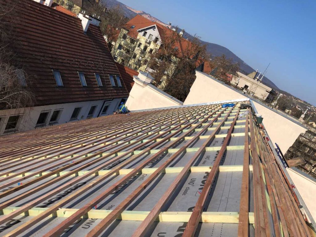 A felvételeken látható, hogy a szakemberek már felszögelték a zárófóliát és az új tetőléceket, sőt a tető egy részére már fel is került az új cserép. Bár még tart a felújítás, a mostani eredményeket látva azt mondhatjuk, hogy magas minőségben renoválják a tetőt.