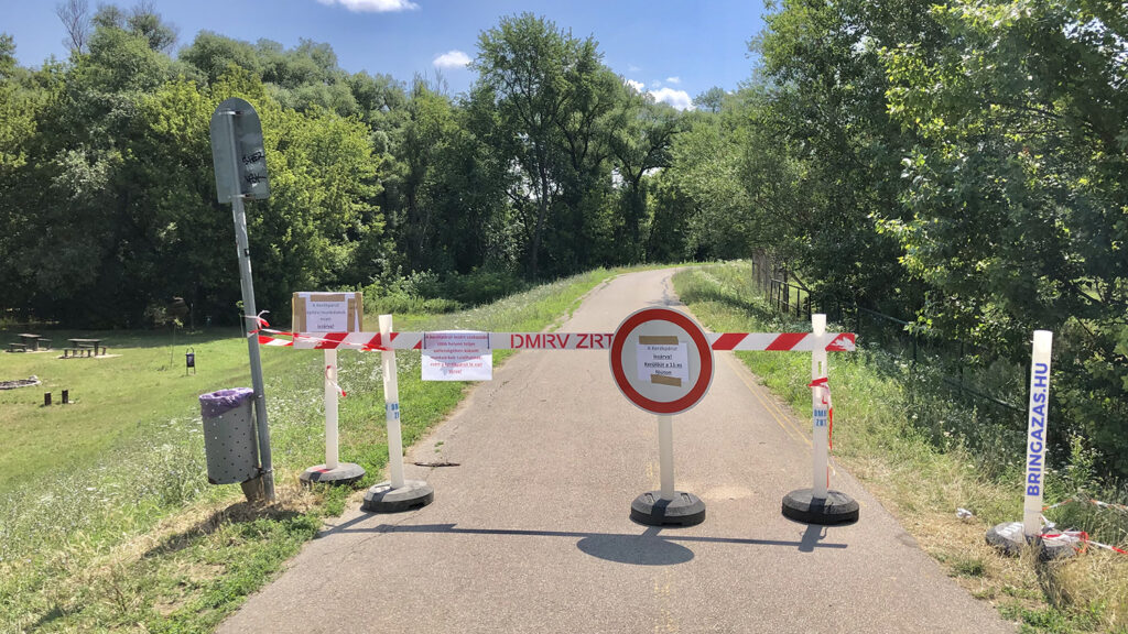 A DMRV a kerékpárút alatt, az árvízvédelmi gátban húzódó regionális szennyvízvezetéken történt meghibásodás miatt zárta le a szakaszt július közepén. A hibaelhárítás során a korábban betemetett szerelőaknákat kellett kibontani. Az aknák műszaki előírásoknak megfelelő helyreállításához egyedi gyártású vasbeton fedlapokra volt szükség, amiket a Szebeton Zrt.-ben gyártottak le. A helyreállítás elhúzódását a kötelezően lefolytatandó közbeszerzési eljárás csúszása okozta.