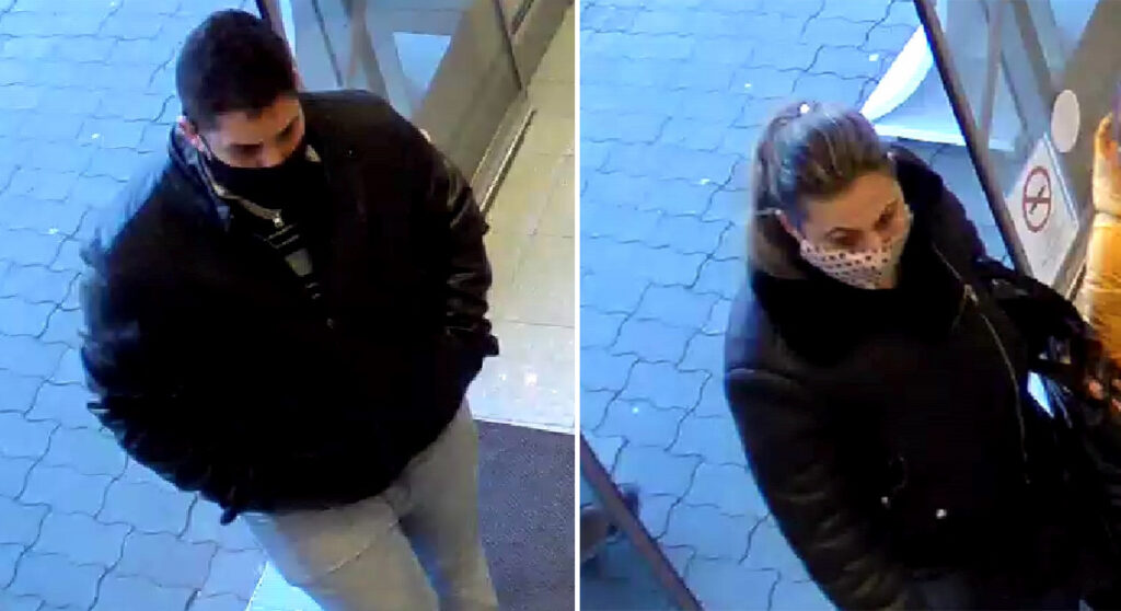 A felvételeken látható nő és férfi 2021. december 8-án egy pilisvörösvári drogériából különböző termékeket lopott.