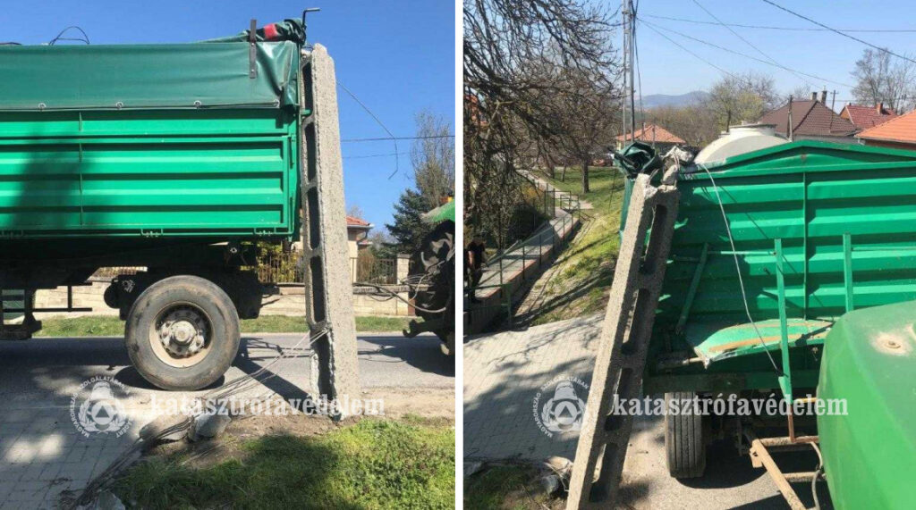 Műtrágyát szállító traktor az úttestről letért, a pótkocsija villanyoszlopnak ütközött április 13-án, szerdán délután Vácdukán, a Kossuth Lajos úton.