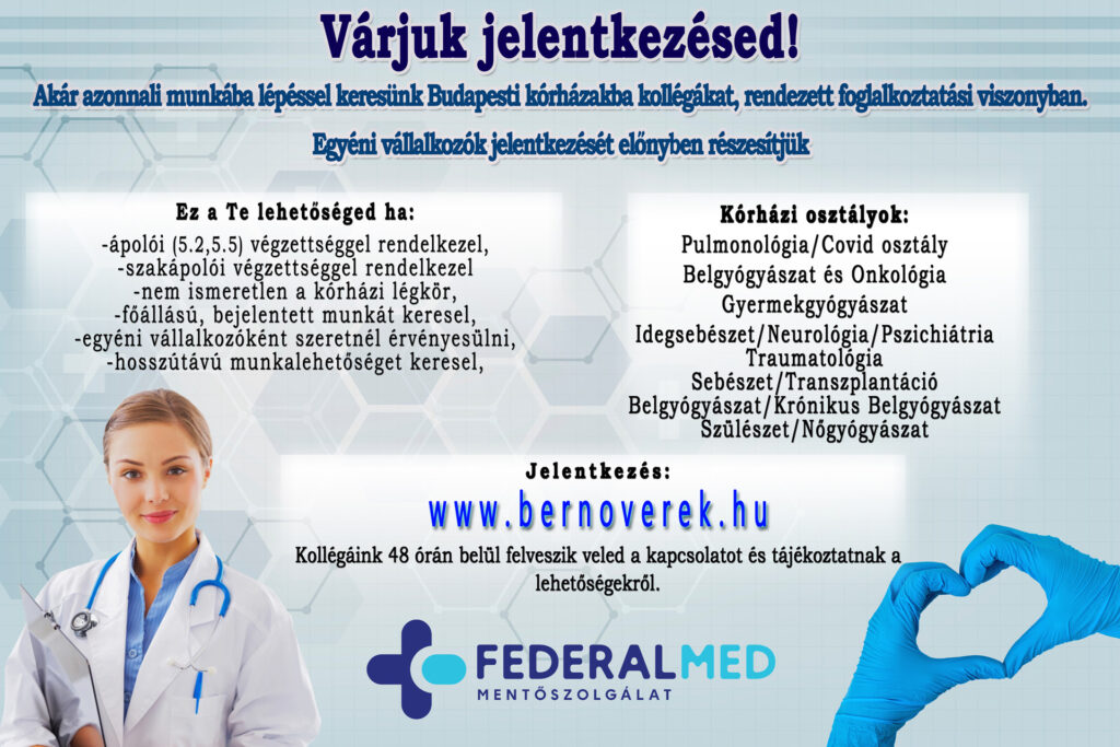 Akár azonnali munkába lépéssel keresnek budapesti kórházakba kollégákat, rendezett foglalkoztatási viszonyban. Az egyéni vállalkozók jelentkezését előnyben részesítik!