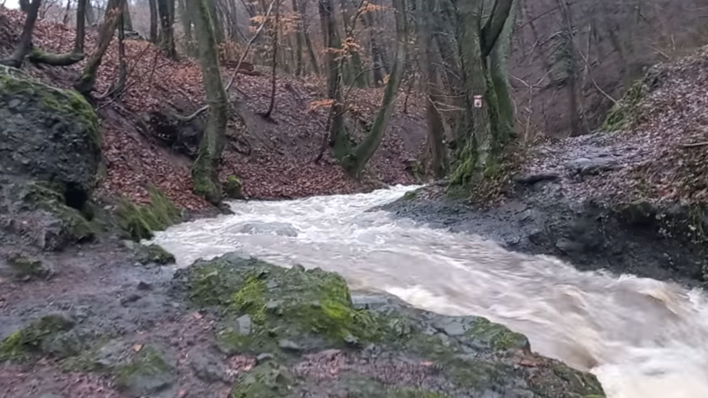 „Ilyen most az Apát-kúti-völgy! Az utóbbi napokban a szokásosnál jóval több eső esett, ami jócskán felduzzasztotta az egyébként oly barátságos patakot” – közölte január 18-án közösségi oldalán a Pilisi Parkerdő.