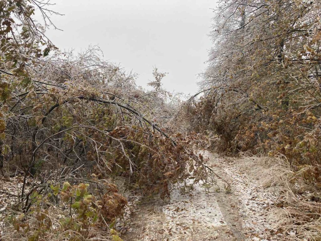 Az elmúlt napok havazása és az azt követő ónos eső következtében a Pilisi Parkerdő erdeiben jegesedés indult a fák ágain.