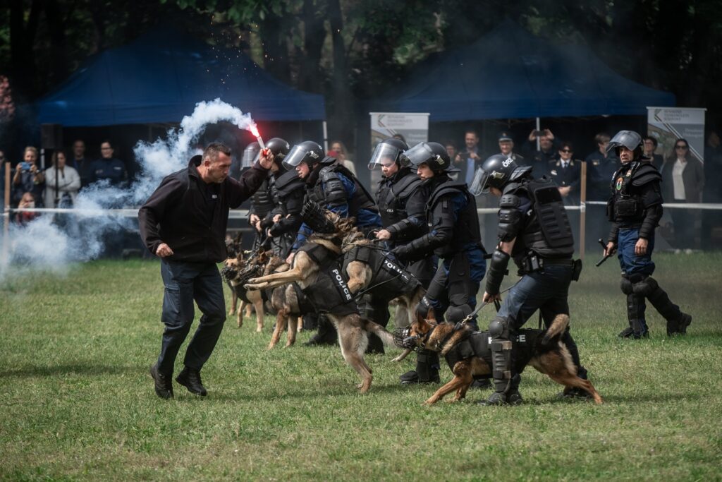 „Immár húsz éve szervezzük meg ezt a nyílt napot, és munkatársaimmal együtt nektek is azt kívánom, érezzétek jól magatokat. Próbáljatok ki mindent, ha valamire kíváncsiak vagytok, kérdezzetek, és mindig tartsátok be a biztonsági előírásokat!” – mondta köszöntőjében Morva László alezredes, a ROKK GSZ KÁF vezetője, és már kezdődött is a kutyás bemutató. „Simizni csak a kutyavezetőket lehet, a szolgálati állatokat nem!” – tréfálkozott Hajdu Tamás törzszászlós, a ROKK GSZ KÁF kiképzője, a program moderátora. Természetesen a füstbombás akció aratta a legnagyobb sikert, és a vaktöltények durrogása okozott szokatlan izgatottságot, de a diákoknak a Készenléti Rendőrség (KR) Különleges Szolgálatok Igazgatósága (KSZI) Bevetési Főosztály III. Lovas és Kutyás Szolgálati Osztály gyakorlata is nagyon tetszett. A szolgálati lovakhoz utána sokan odamentek, és persze járőrkutyát is lehetett simizni, bár a látottak után erre csak kevesen vállalkoztak.