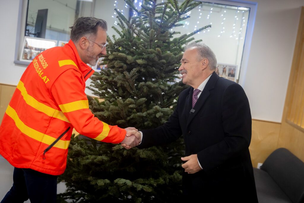 Az Országos Mentőszolgálat főigazgatója kifejtette, a karácsony az elcsendesedésről szól, de a mentőknél ez az egyik legsűrűbb időszak. Az Agrárminisztériumnak és az állami erdészeti társaságoknak köszönhetően mind a 256 mentőállomásra eljutnak az örökzöldek. Ezek a fenyőfák hozzájárulhatnak ahhoz, hogy a karácsonyi időszakban a szolgálatot teljesítők a mentőállomásokon kicsit fel tudjanak töltődni, és újult erővel tudják a felelősségteljes munkájukat ellátni. Dr. Csató Gábor köszönetet mondott a bajtársak egész éves helytállásáért és szolgálatáért is.