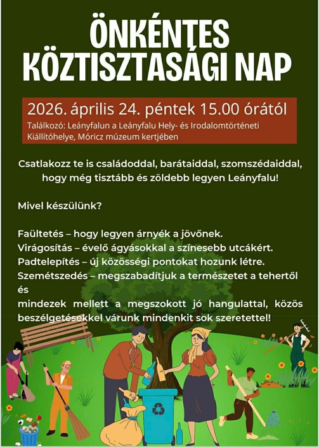 Szereted Leányfalut? Szeretnéd, ha még zöldebb, tisztább és barátságosabb környezetben sétálhatnál? Akkor itt az idő: mozduljunk meg együtt egy közös cél érdekében! A szervezők várnak téged, családodat, barátaidat és a szomszédokat egyaránt egy vidám, dolgos délutánra, ahol nemcsak a környezet szépül meg, de a közösséget is építeni fogják. Közeleg a 2026. április 24-én 15 órakor kezdődő Önkéntes Köztisztasági Nap!